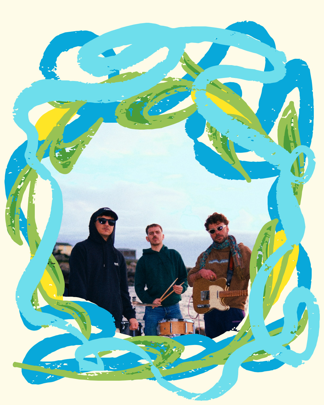 Hugo (baixo eléctrico e voz), Germán (voz principal e Guitarra eléctrica) e Brais (batería) chegan dunha vila costeira do sur de Galicia, A Guarda.